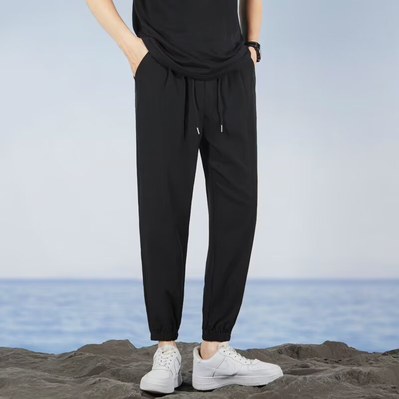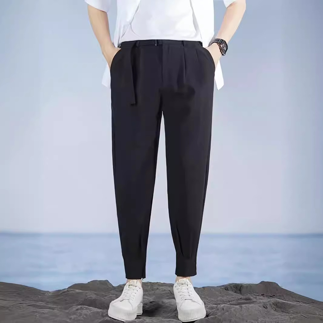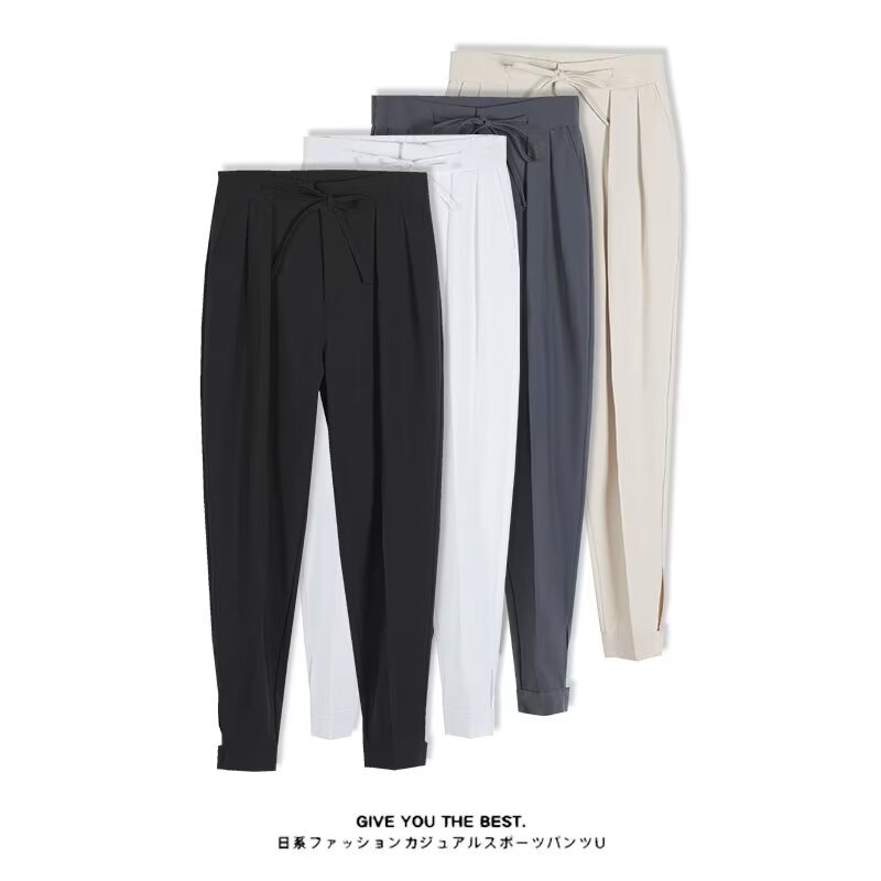 ひも引き運動氷糸通気ズボン男夏薄手速乾直筒ゆるい垂れ感束足九分カジュアルパンツ