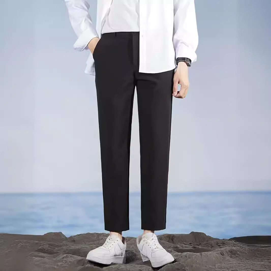 夏の薄いタイプの9分のスーツのズボンの男性の2024年の新型のまっすぐな筒のペンダント感の男性のアイロンをかけないでカジュアルなズボンのズボンのズボン