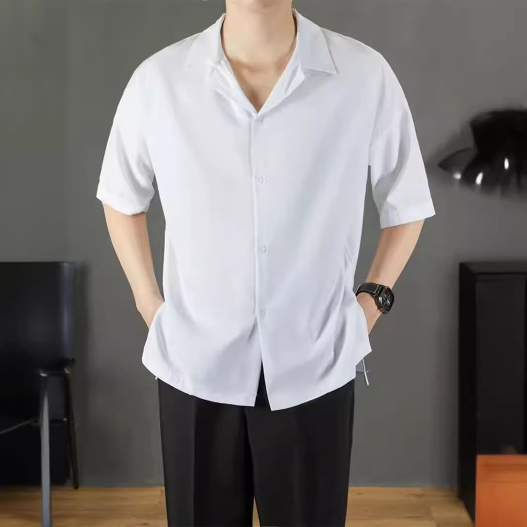 夏の純色速乾半袖シャツ男服高級上着スキューバ襟垂れ感トレンド無熱半袖白シャツ