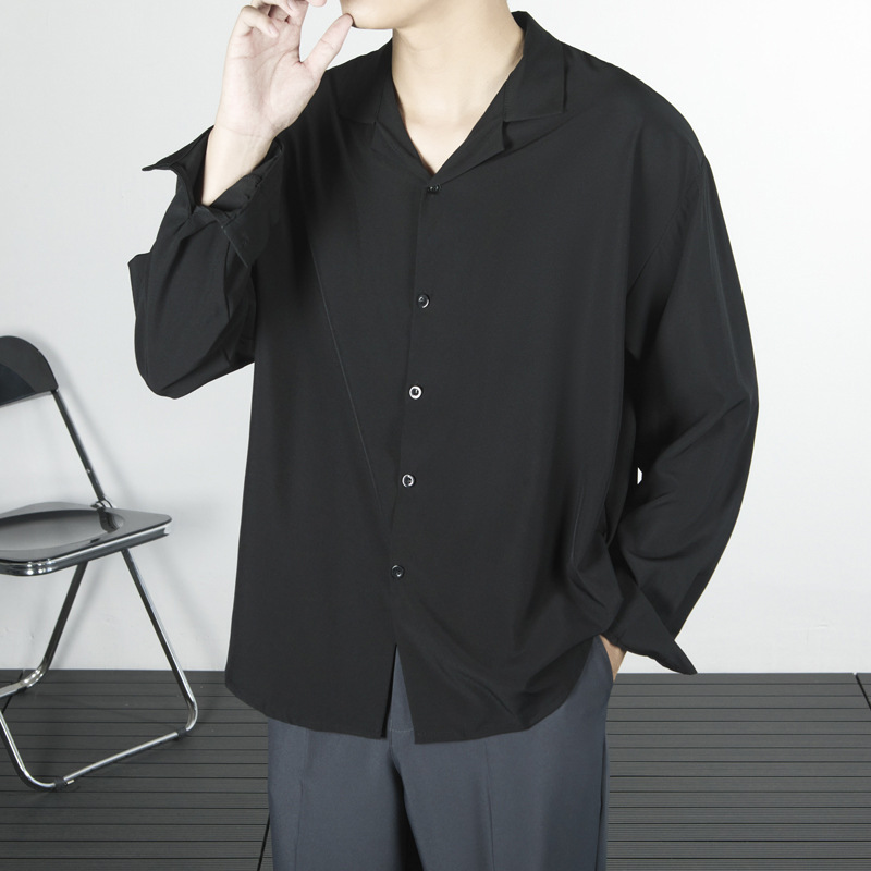 キューバ襟長袖シャツ男性春秋潮牌ins軽熟風痞帅ゆるい純色カジュアルシャツコート