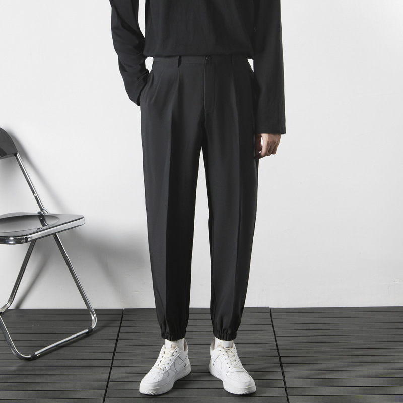 ズボンの男性の2024新型の黒色のズボンの男性の金の修身のまっすぐな筒の9分の韓国版のファッションのブランドのひものカジュアルなスーツのズボン