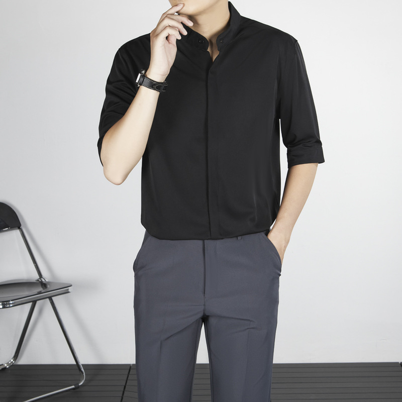夏半袖黒シャツ男軽熟風韓国版修身パーマフリーアイス五分中袖新中国式シャツ男