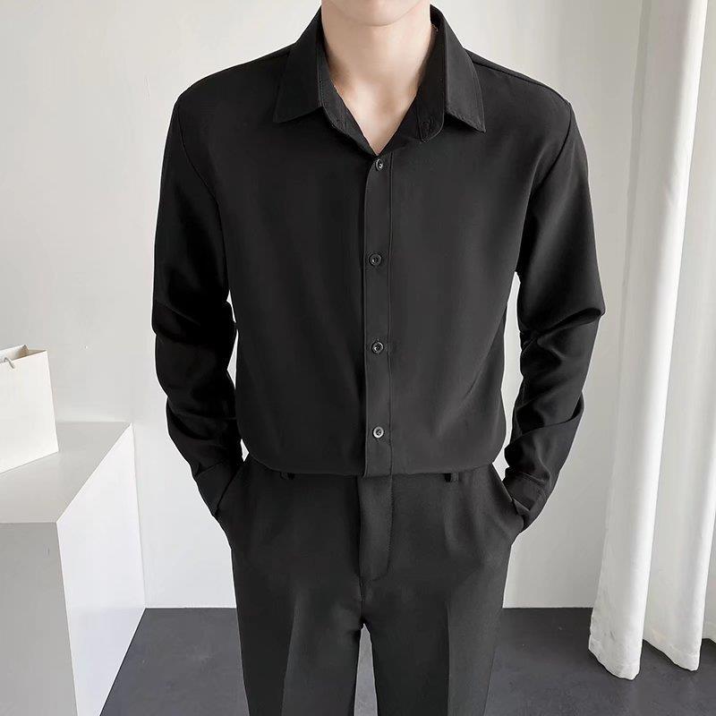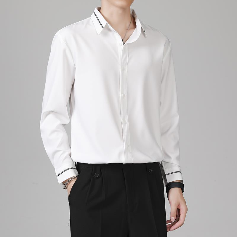 春の夏の黒いシャツの男性の長袖の中にアイロンをかけないカジュアルな上着の男性のファッションの垂れ下がった感じのdkの白い男性のシャツを掛けます。
