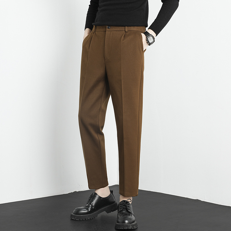 冬季九分毛呢小西裤男直筒复古咖啡色松紧修身柔滑毛料棕色休闲裤