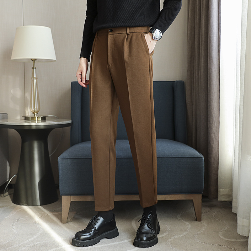 冬季九分毛呢小西裤男直筒复古咖啡色松紧修身高级毛料棕色休闲裤
