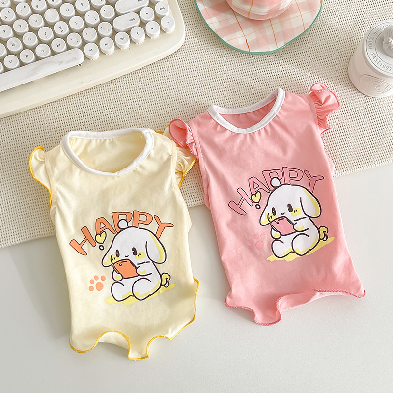 越境春秋新型HAPPY蓮の葉の袖のベストのかわいい漫画の犬の小さい中型の犬のペットの服の卸売り