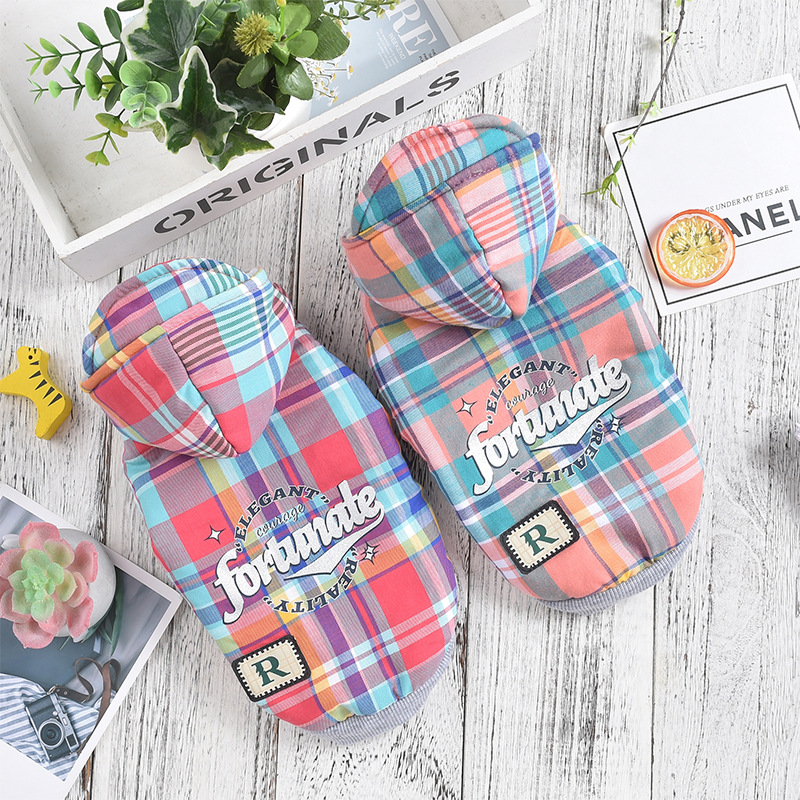 ペットの服の現物の卸売りの経典の格子は帽子の両足の秋冬の厚い金の小さい中型の犬の服装をつなぎ合わせます。