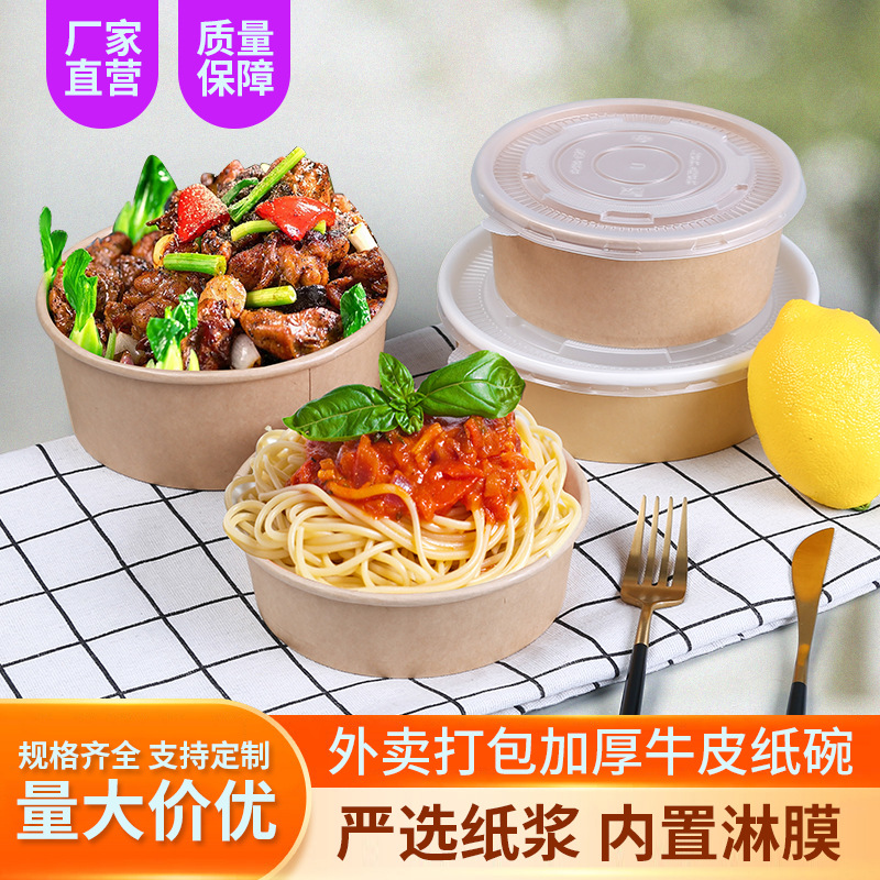 クラフト紙の碗は蓋を持って厚い使い捨ての円形の包装箱のスープの碗のファーストフードの箱の業務用のテイクアウトの環境保護のサラダの碗