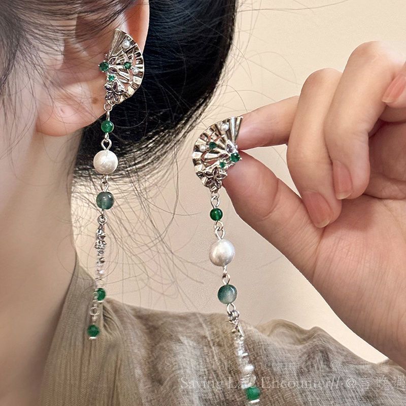 耳骨挟み扇形平安ボタン流蘇イヤリング感無清冷耳飾り新中国式女性古風国風耳洞ロングタイプ