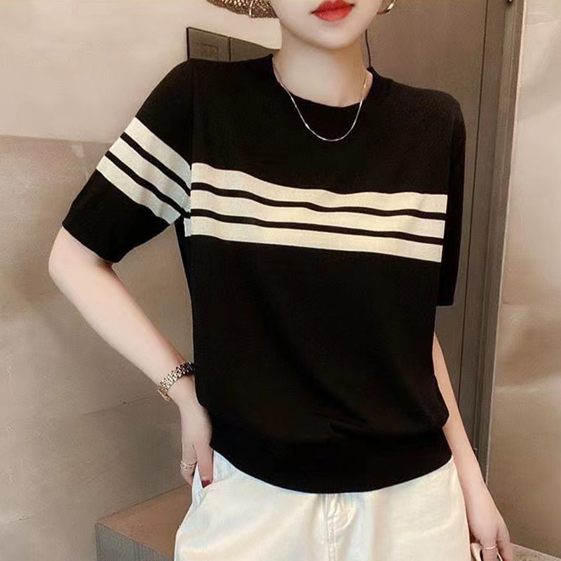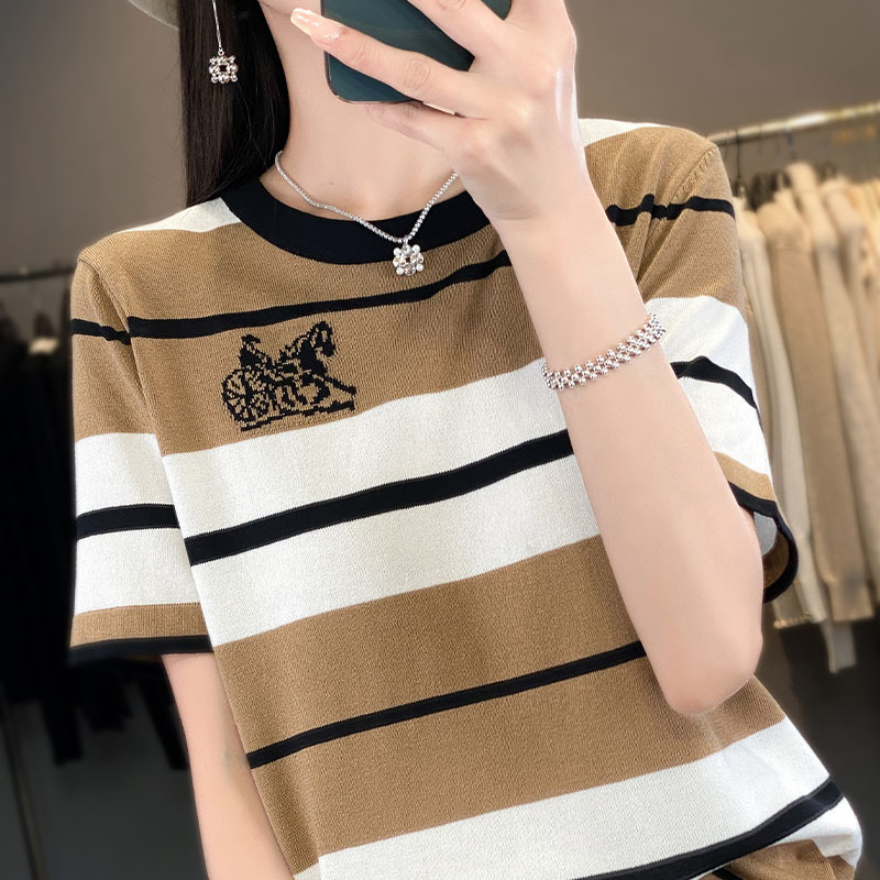 夏の新型女装曲珠氷麻糸半袖女性ニットtシャツ女性丸首縞馬車刺繍