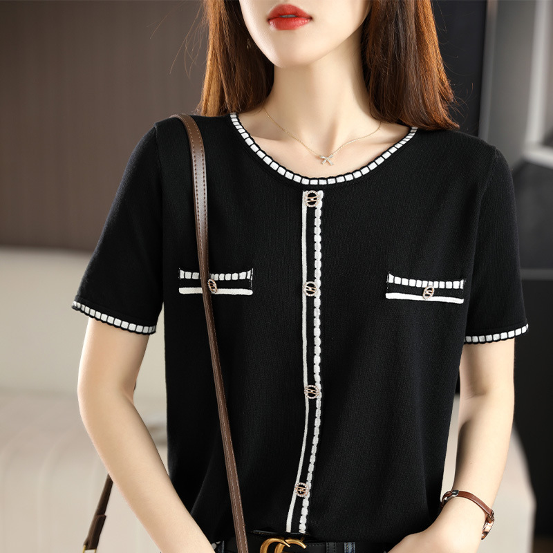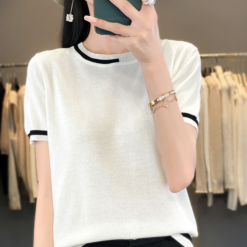 2024年夏の新型丸首半袖アイスニットの女性の透かし彫りの薄いタイプの底のシャツの気質は上着をかぶせます。
