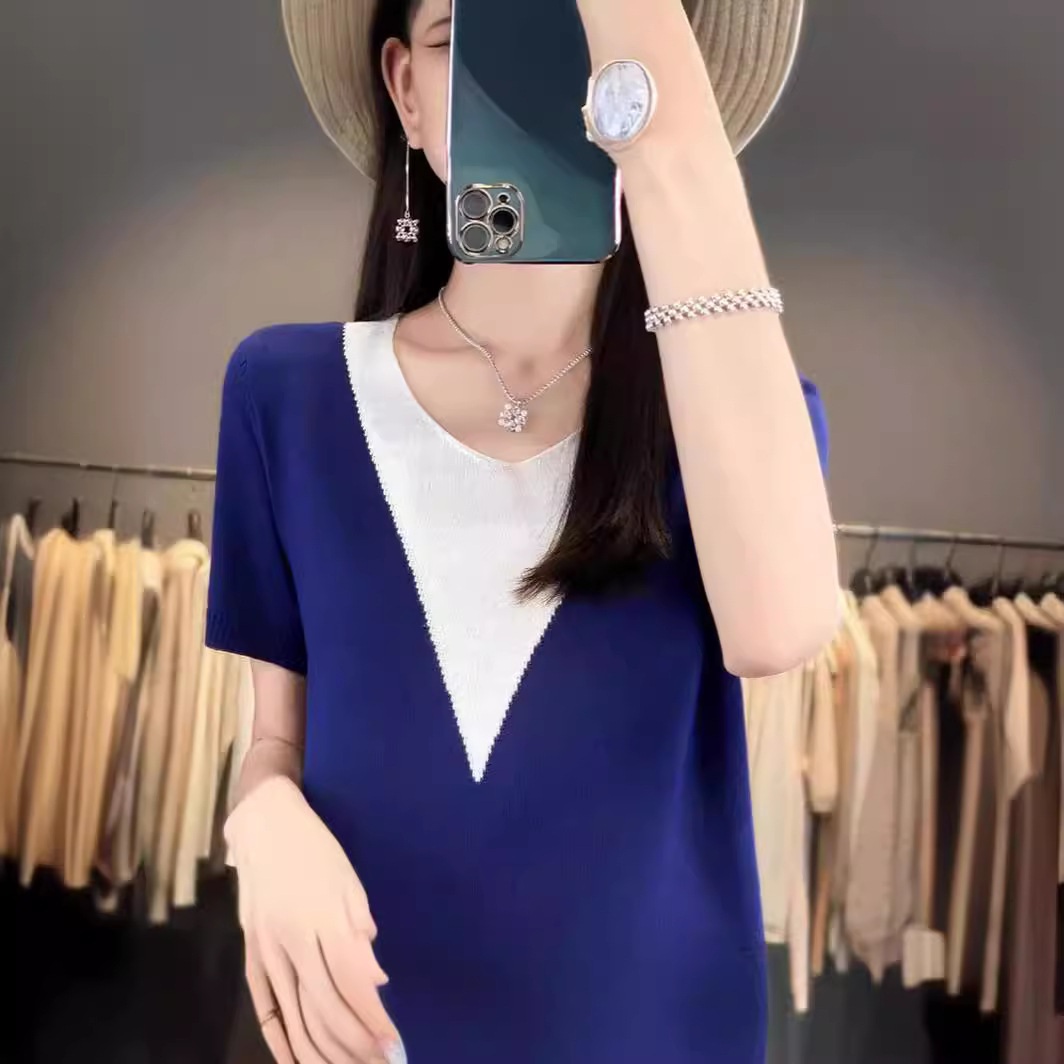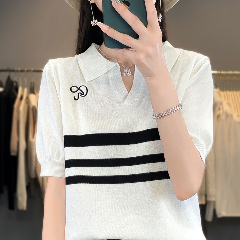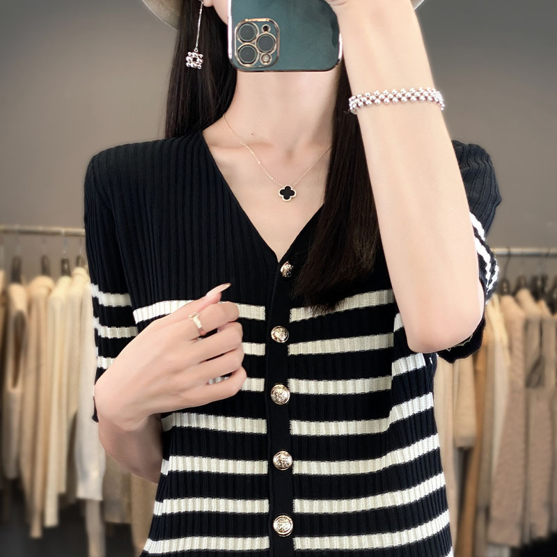 2024年夏の新型氷糸vネックニットの女性半袖は色の縞の薄いニットの底のシャツの上着にぶつかります。