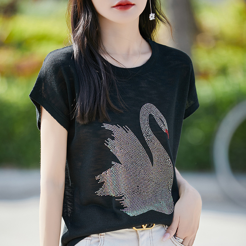 24年夏の新型天糸绢糸混紡丸襟メリヤスジャカードレース釘珠半袖透かし彫り上着