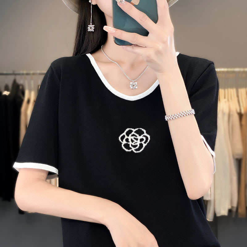 卸売りの気質の小さい香風のツバキの花の氷の糸の半袖の女性の2024夏の新型の丸首の百合のニットの底のシャツ