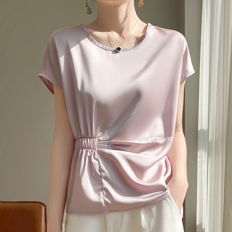 2024年夏の新型ゆるい純色の百合は腰の純色のtシャツの丸首のサテンの半袖のtシャツの上着を収めます。