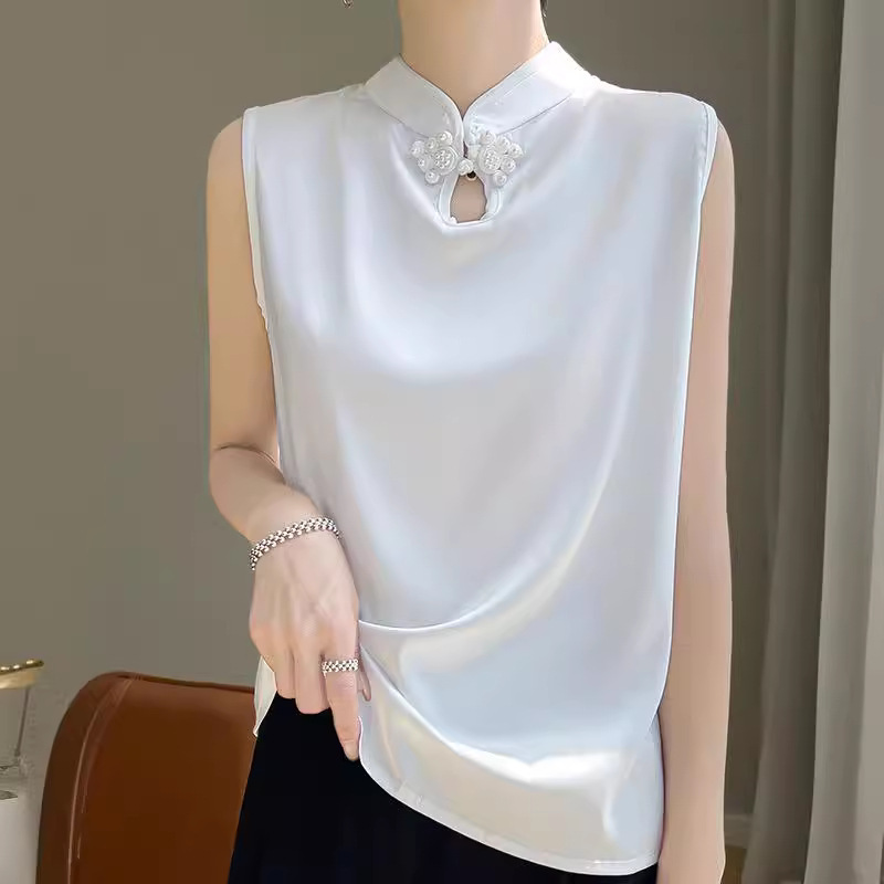 中国式国風盤ボタン女装2024春夏新作サテン純色立襟袖なしレトロ開叉上着tシャツ
