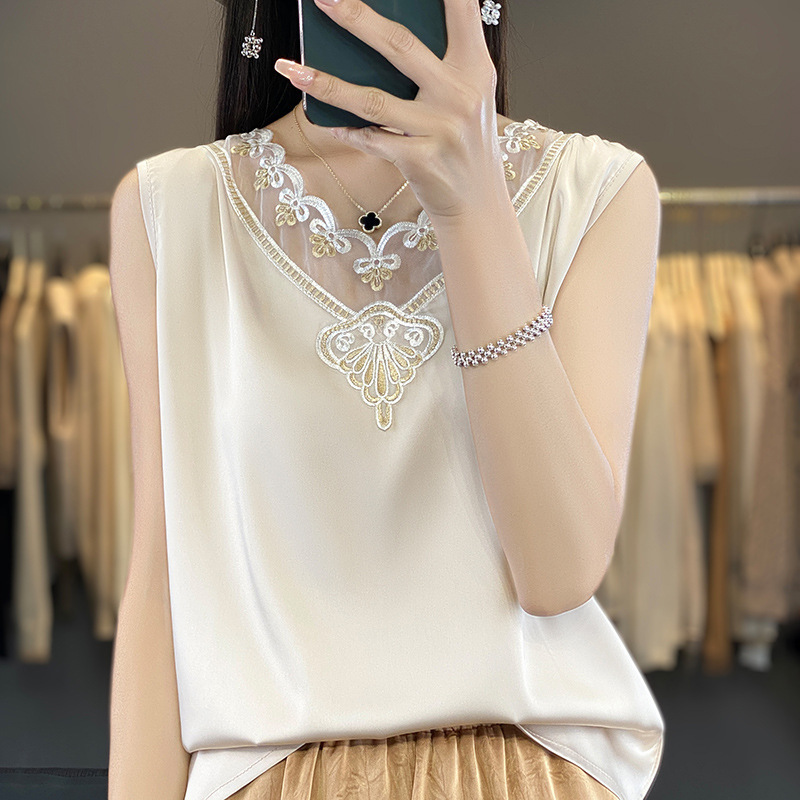 代発2024年夏の新型袖なしサテンレースのキャミソール女性のシャツスーツの中に丸襟がついている