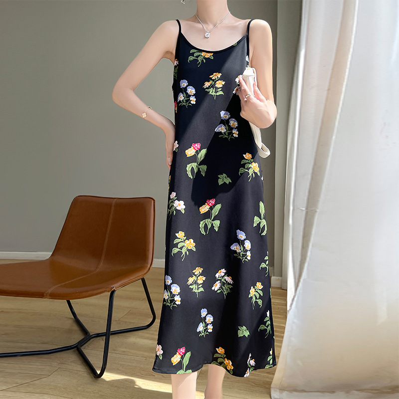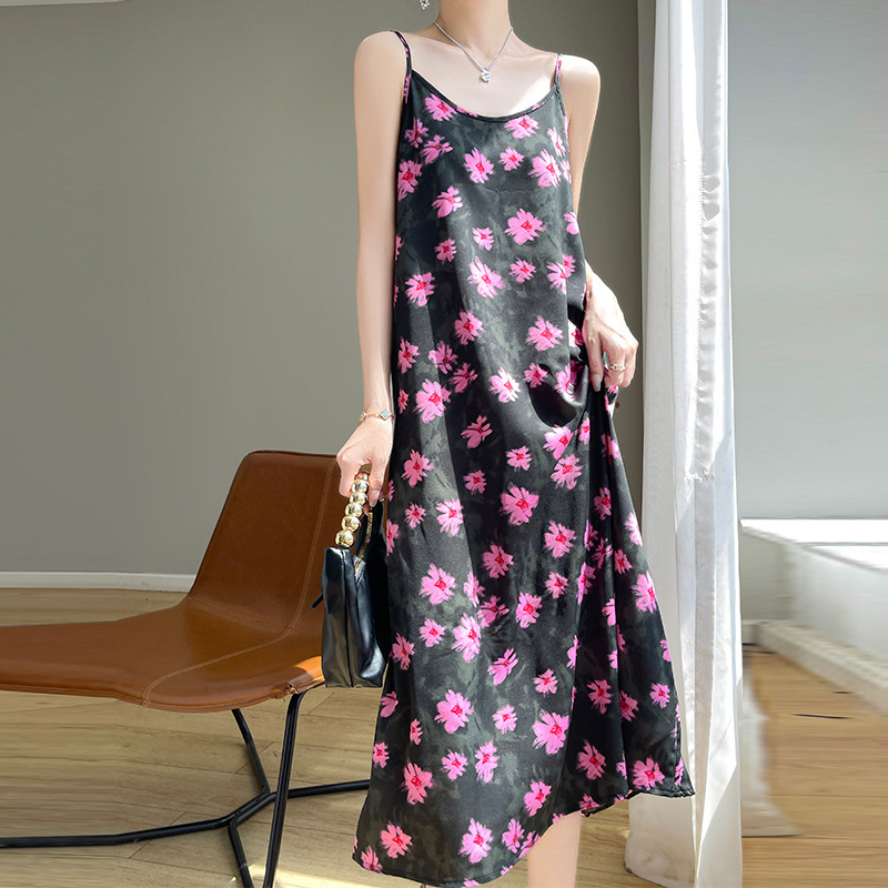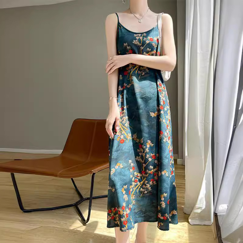 2024年夏新作フレンチサテンプリント丸首ストラップワンピース女性気質レトロ花柄ロングスカート