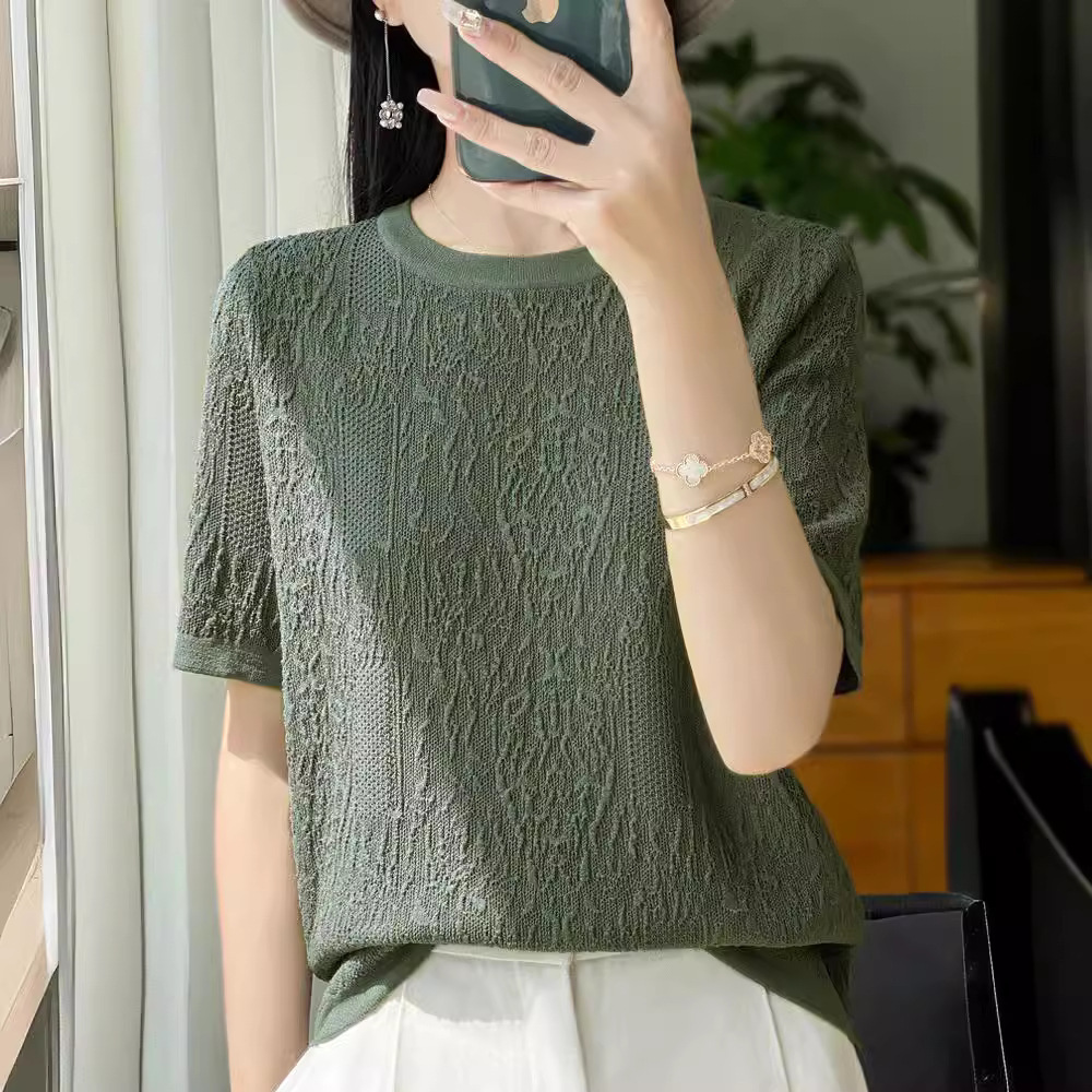 卸売り丸襟ジャカード半袖tシャツ女性2024夏の新型洋気独特の氷糸ボディシャツ半袖