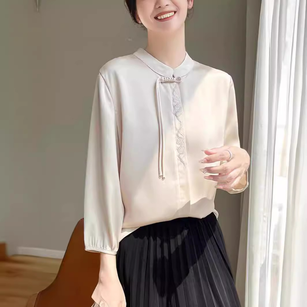 夏の新型新中国式復古風上着と国風盤ボタンの高級感上着のサテン長袖シャツ