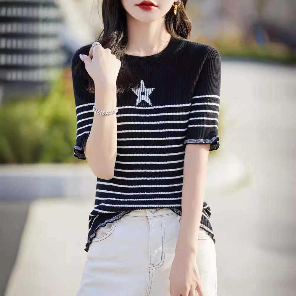 2024夏の新型衝突色縞星模様半袖上着の女性丸首カバー