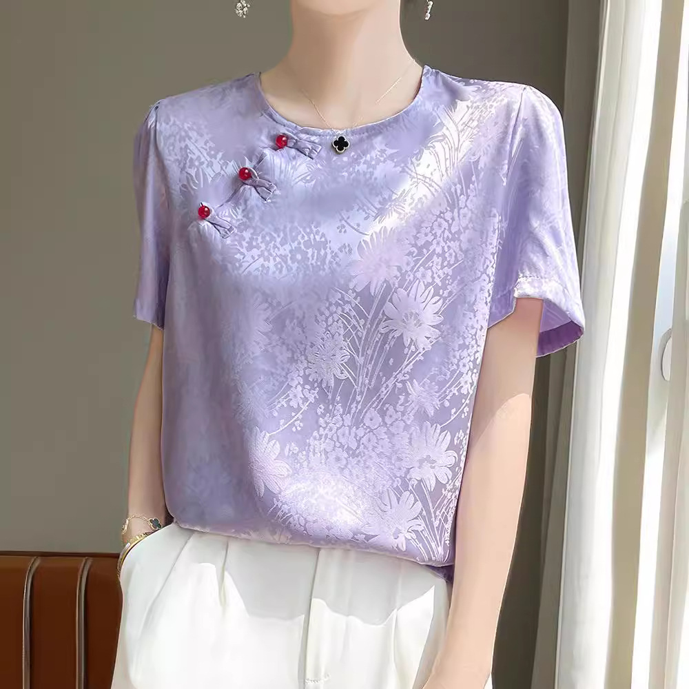 新中国式国風真糸女夏薄金改よクレアチニン绢糸酢酸サテン丸首半袖シャツ