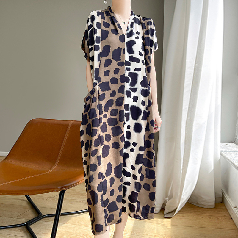 2024年夏の新型軽豪華サテンヒョウ柄プリント半袖ワンピース女性気質洋気高級ロングスカート