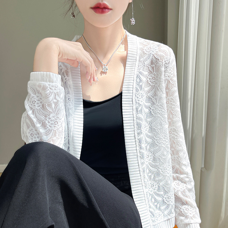 2024夏の新型vネック透かし日焼け止め九分袖コート女性の外にワンピースのカーディガンを合わせます。