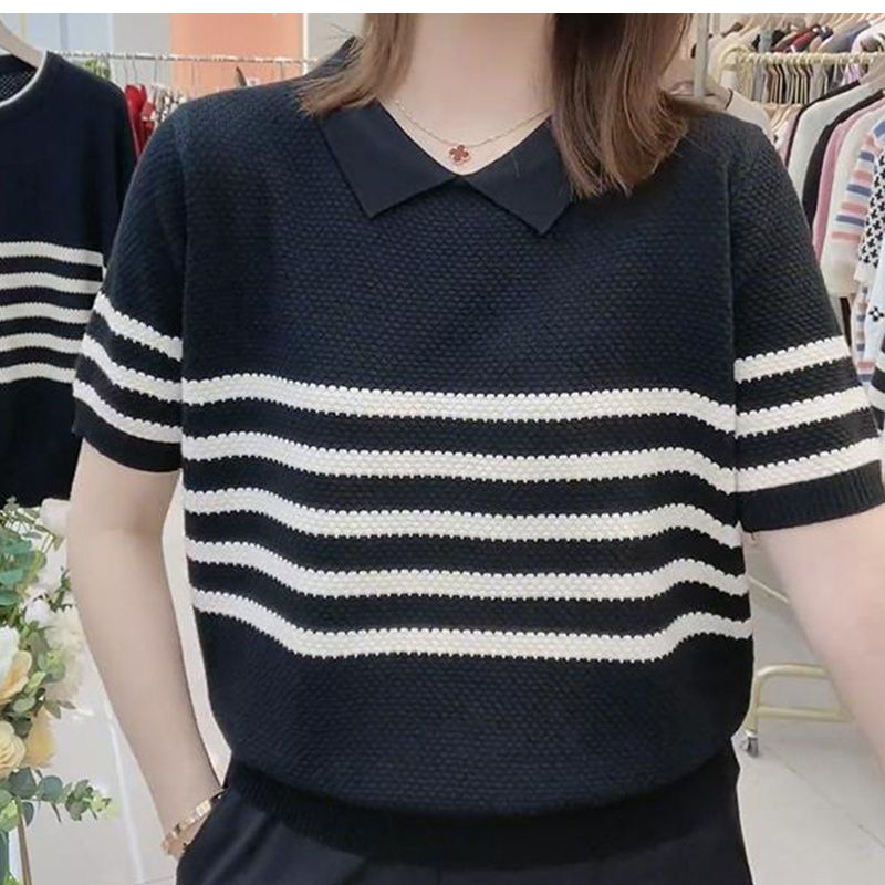 色のストライプの半袖のニットのシャツの2024夏の韓国版の簡単な上着の頭の子供の襟の綿のtシャツ