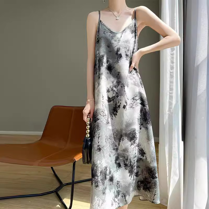 2024春夏新作カラープリント片肩帯ポリエステルサテンサスペンダースカート丸首ロングワンピース