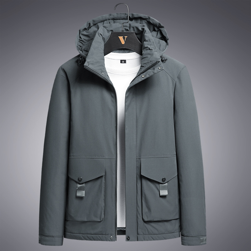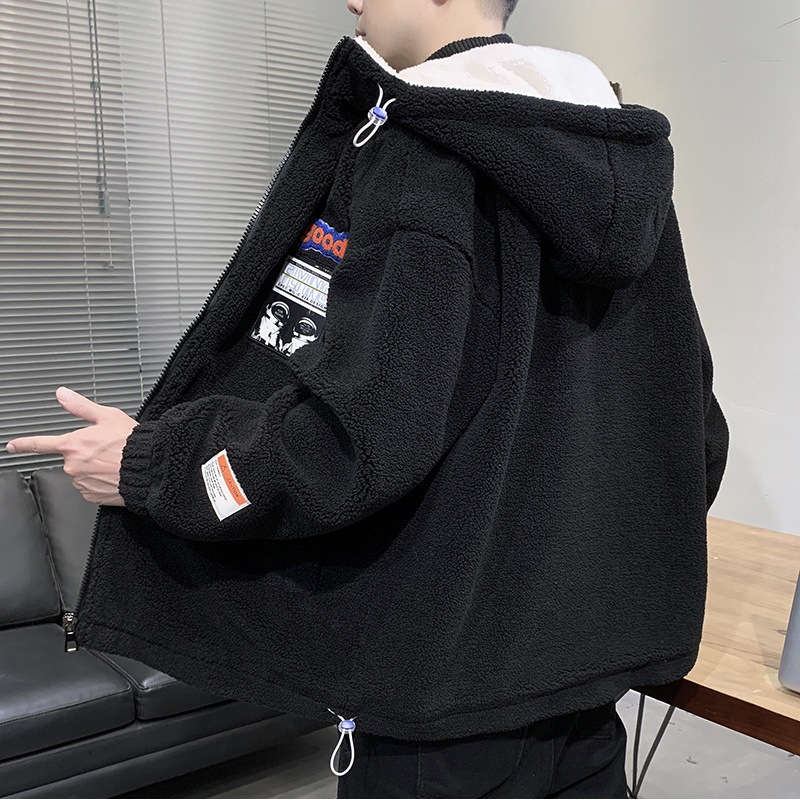 秋冬帽子付きファスナー現物保温黒色普通青年合体型カジュアルサイドスリットポケットジャケット