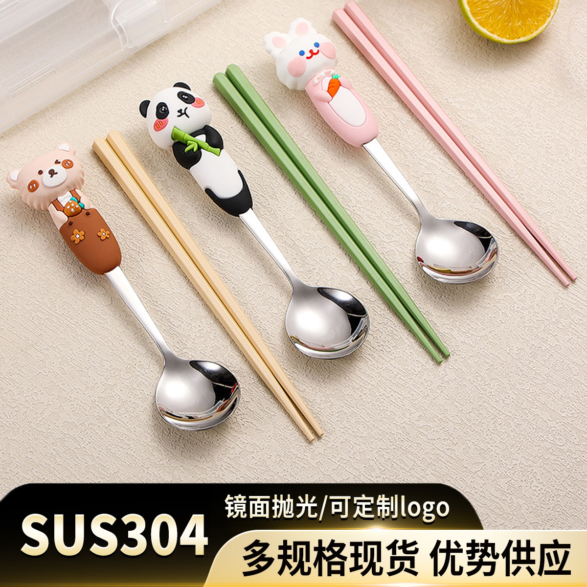1688304ステンレス携帯食器子供漫画家庭用パンダ2点セットウサギ熊箸スプーン