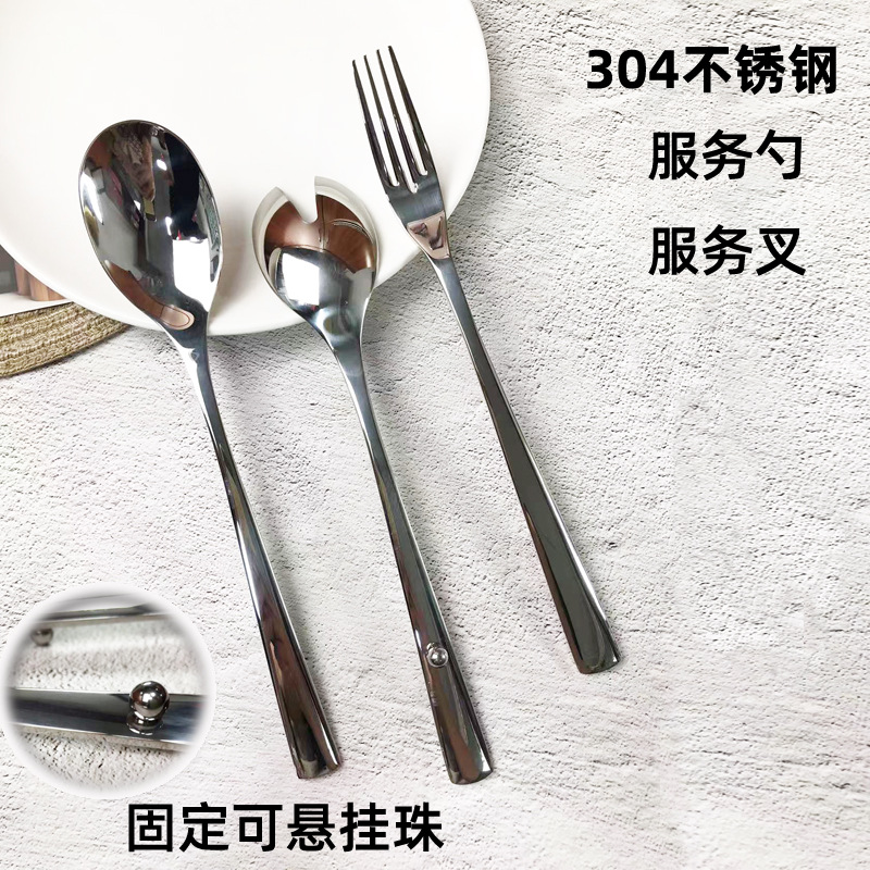 1688304ステンレスの厚いサービススプーンの分菜のスプーンのフォークのセルフサービスのサラダのフォークのホテルの配膳のスプーンは吊り下げのビーズを持っています。