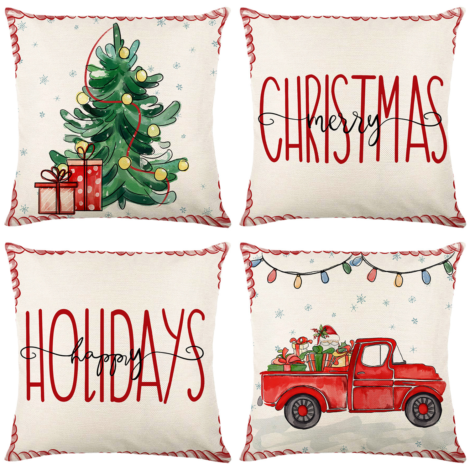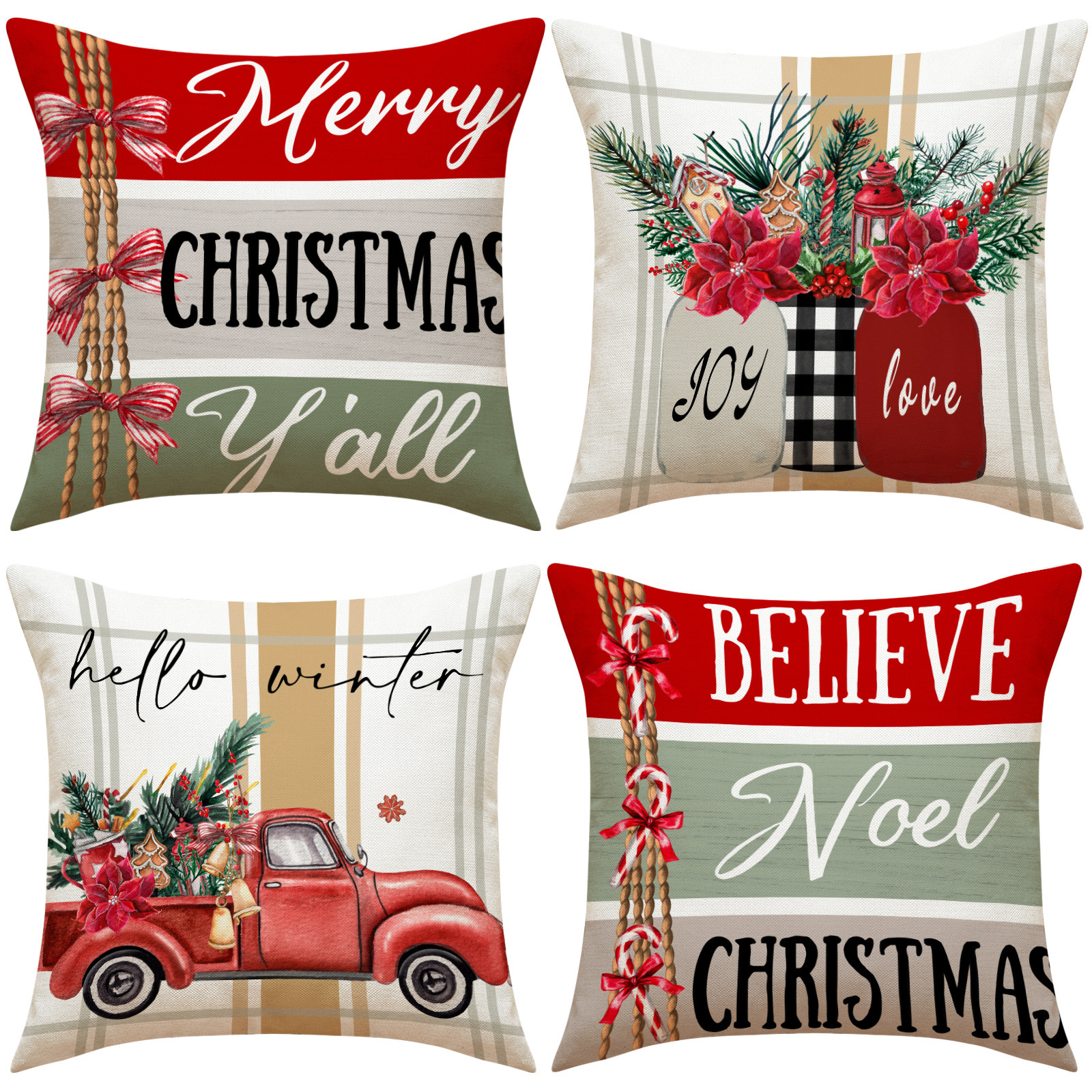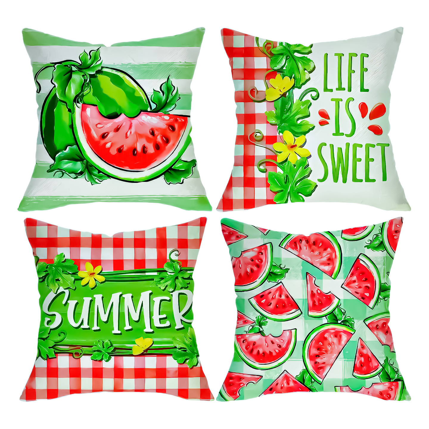 モダンなスイカレターチェック柄プリントクッションカバー4点セット、リビングルームクッションカバー、オールポリエステルリネンソファクッションカバー