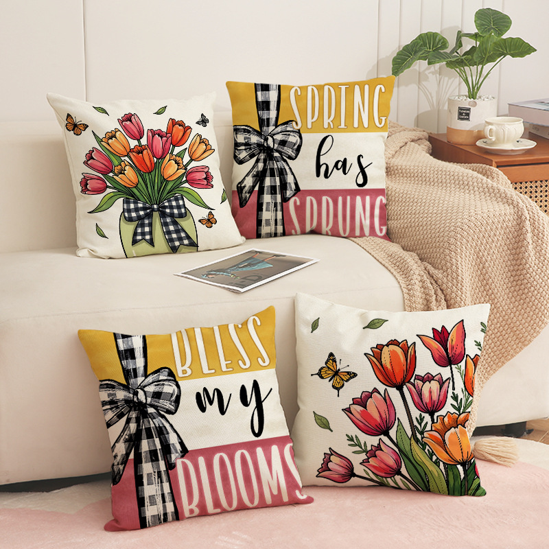 Amazon 春チューリッププリント枕カバーレター花装飾ソファクッションカバーホームカークッション
