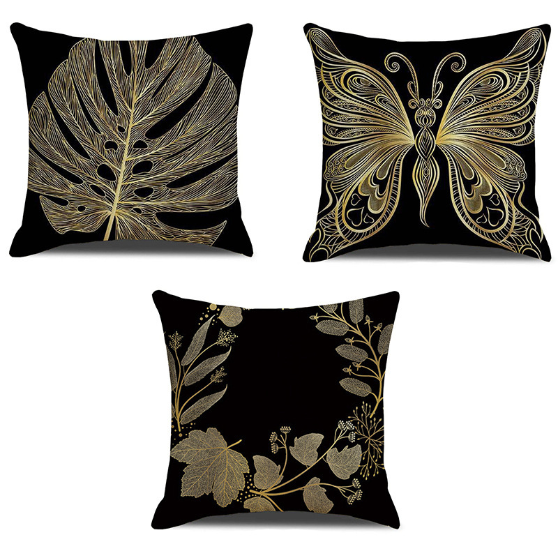 新しいブラックゴールド蝶の葉プリントリネンスロー枕カバー寝室のソファクッションスロー枕カバー家庭用品卸売