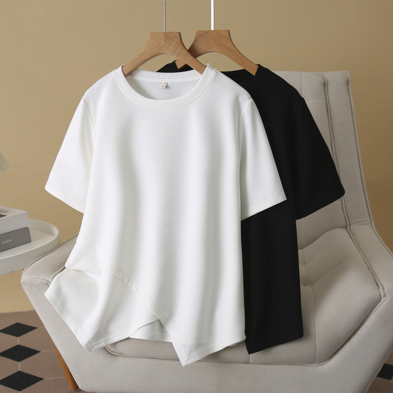大きいサイズの婦人服の半袖のtシャツの不規則な裾の2025夏の小さい大衆のファッションの上着はフォークを開けてカジュアルなシャツの2523を並べます。
