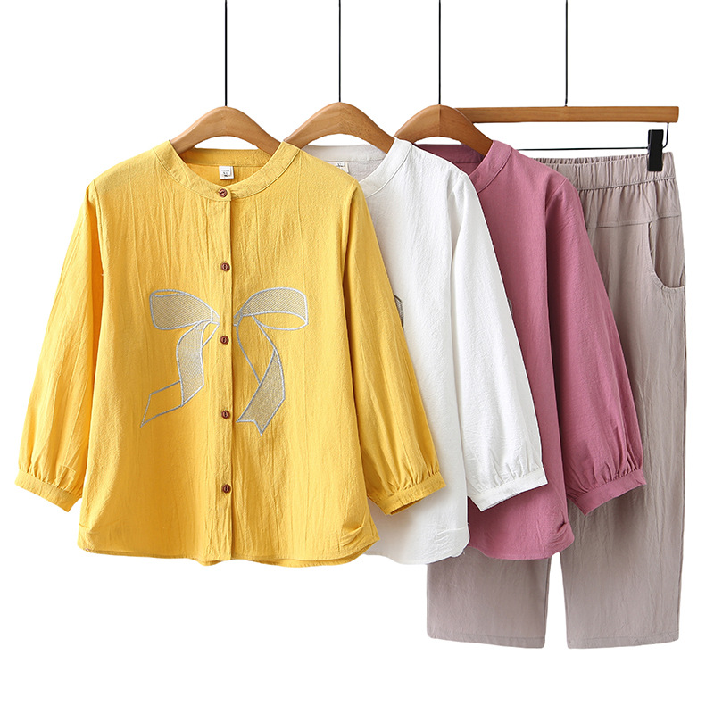大きいサイズのシャツの刺繍の7分のズボンの女性のスーツの2025春の綿のシャツの7分の袖の蝶結びの中でズボンの太っている妹の653
