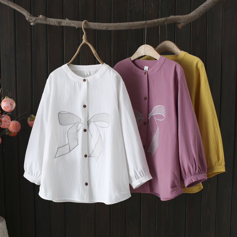 大きいサイズの婦人服のシャツの刺繍の綿のシャツの2025春の復古の7分の袖のカーディガンの太っている妹のシャツの丸首の上着651