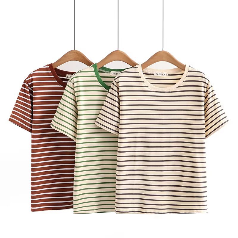 大きいサイズのストライプのシャツの半袖の婦人服の2024夏のカジュアルなtシャツの太っている妹の丸首の綿のシャツの上着の2404