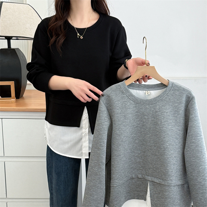 大きいサイズの衛衣の偽の2つのファッションの婦人服の2025春の長袖は色の上着の太っている妹にぶつかってやせているファッションの小さいシャツの潮891を現します。