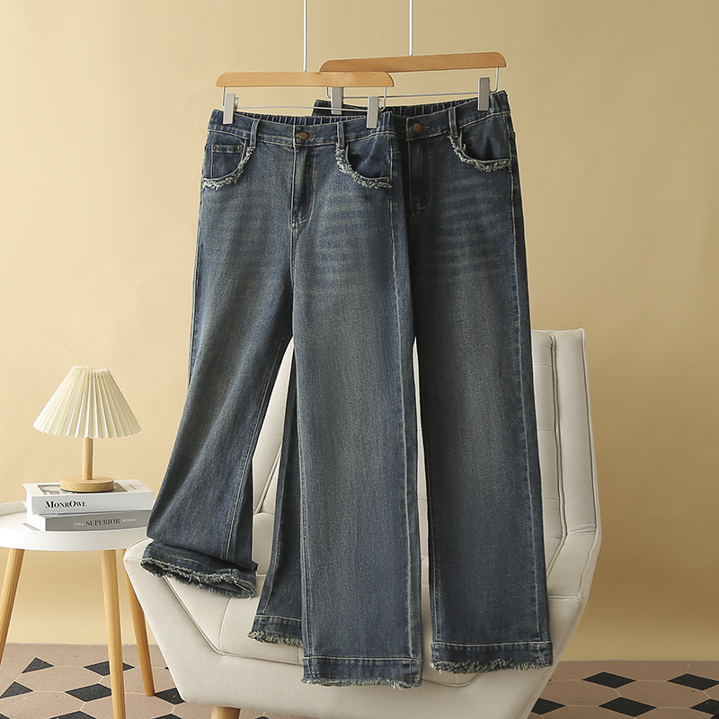 2025春の大きいサイズのストレートズボンはやせている女性のズボンの太っている妹の韓国版の復古のズボンの毛の縁のジーパンのファッションの8621を現します。