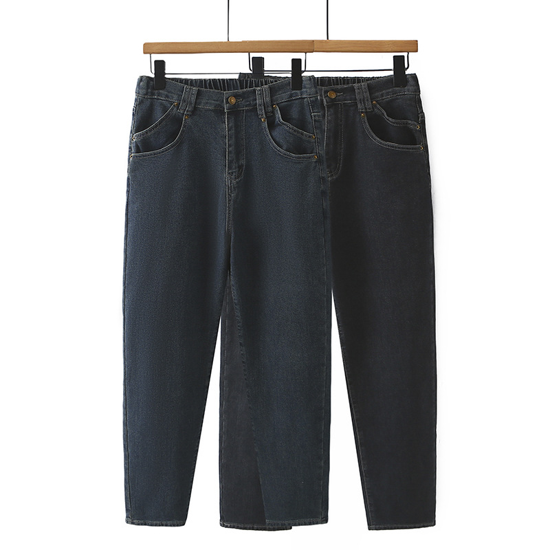 2024冬にベルベットのジーンズの大きいサイズの高腰のズボンの厚いズボンの弾力的なストレートパンツの太った妹は痩せている6529-1
