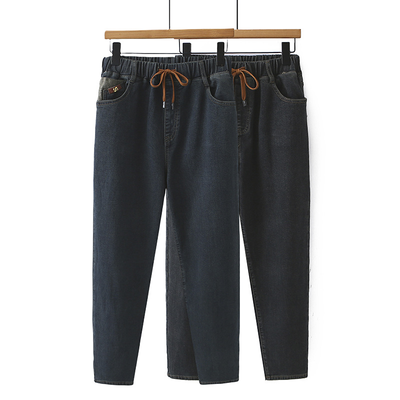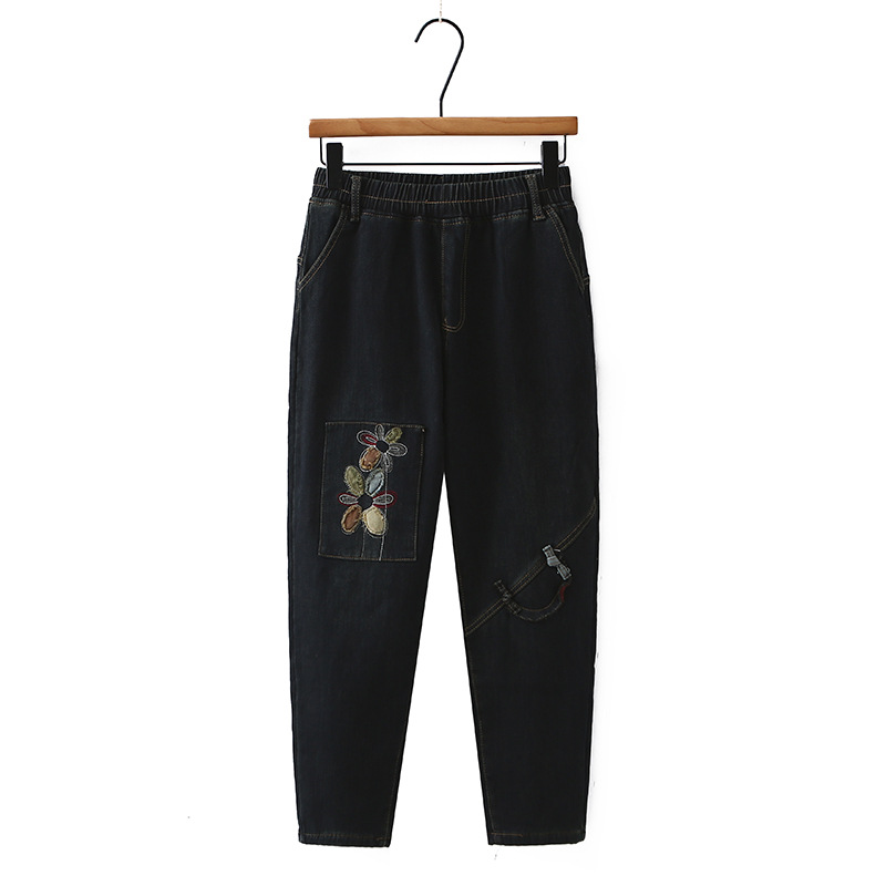 2024冬にベルベットのジーンズの大きいサイズの女性のズボンの刺繍の弾力性が痩せている9分のズボンの太った妹の厚いハーレムのズボン