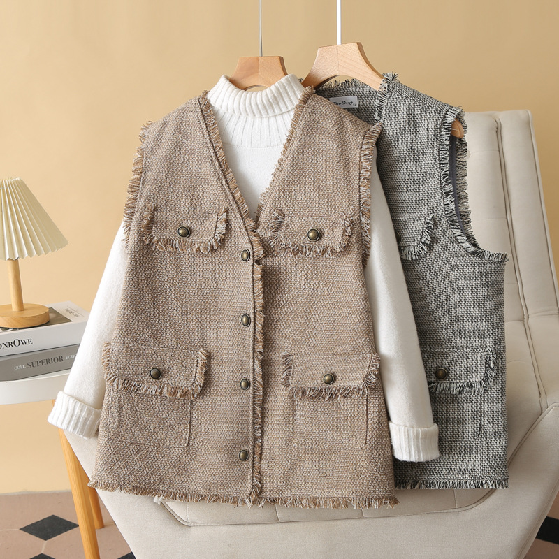 2024秋の大きいサイズのフリンジの馬は女装の小さい香風の復古のファッションのvネックのベストのカーディガンの太っている妹を挟んでやせている7010を現します。