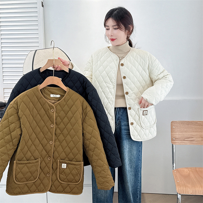 太った妹の薄い綿服の丸襟の布の新型の2024冬の大きいサイズの女性の綿服の菱の形の格の綿入れの上着はファッションの2410を合わせます。