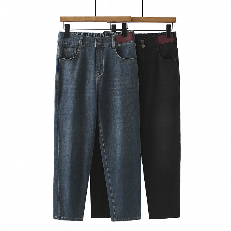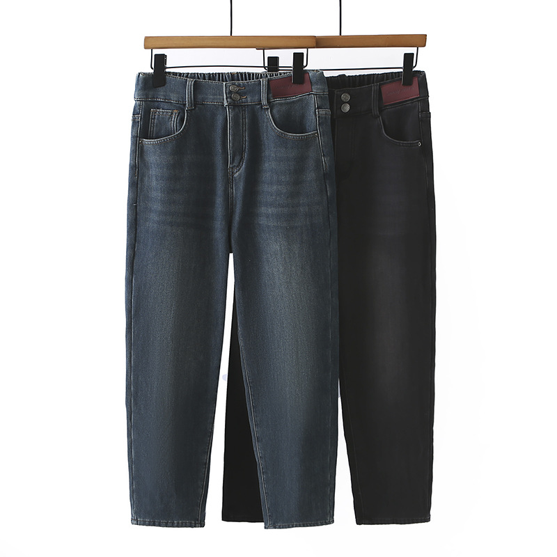 大きいサイズのベルベットのジーンズは腰がゆるんでいて、女性のズボンを厚くしている2024冬の太った妹の保温ハーレムのズボンの弾力性6538-1