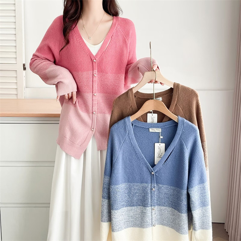 2024秋のグラデーション色のニットの大きいサイズの婦人服のvネックの非対称のセーターの太っている妹の弾力の小さい大衆の上着の6053