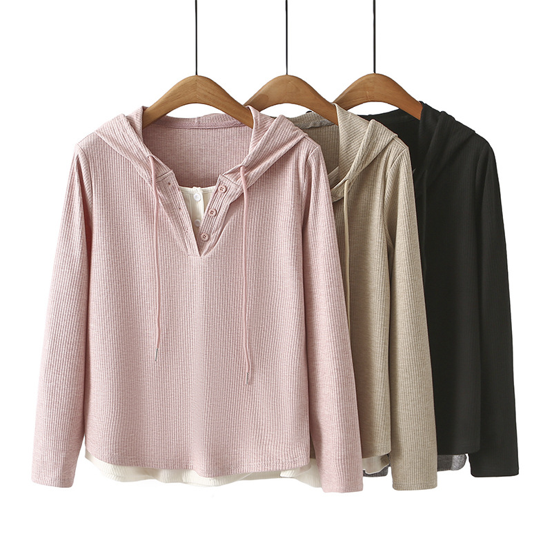 大きいサイズの帽子の衛衣の偽の2つの婦人服のカジュアルな帽子のシャツの2024秋の長袖の上着の太っている妹はやせているtシャツの潮690を現します。