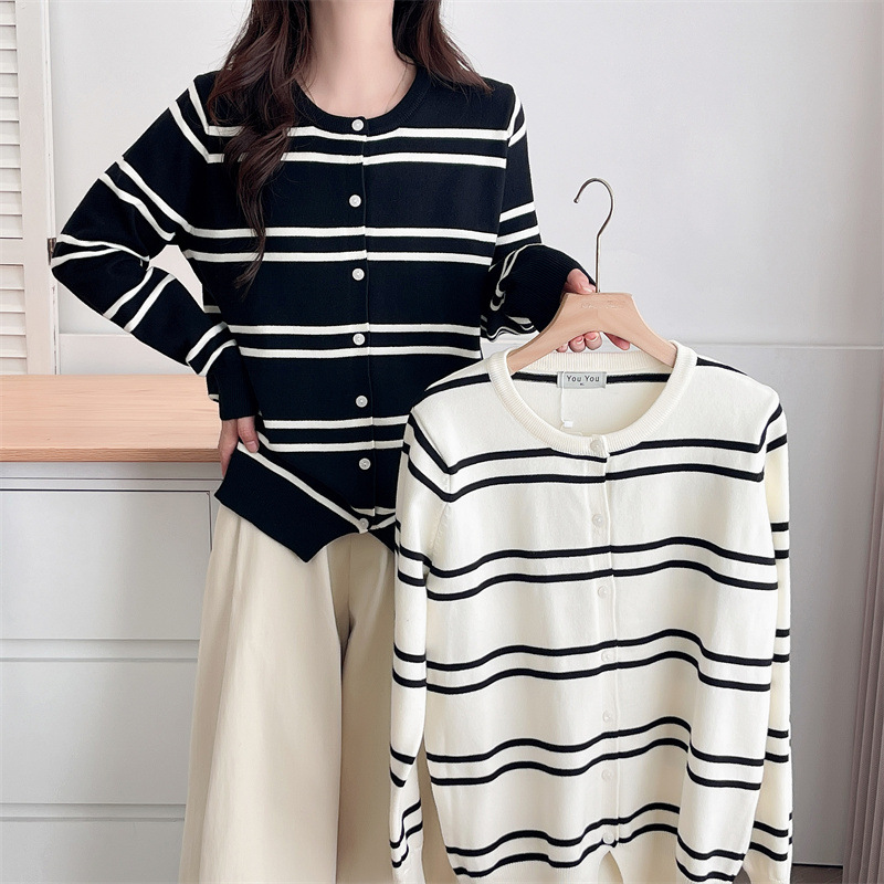 2024秋のストライプシャツのコートの大きいサイズの女性のニットの小さい大衆の太った妹の弾力性の白黒のカーディガンの長袖のセーターの4070